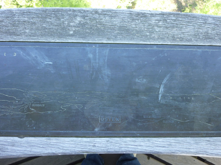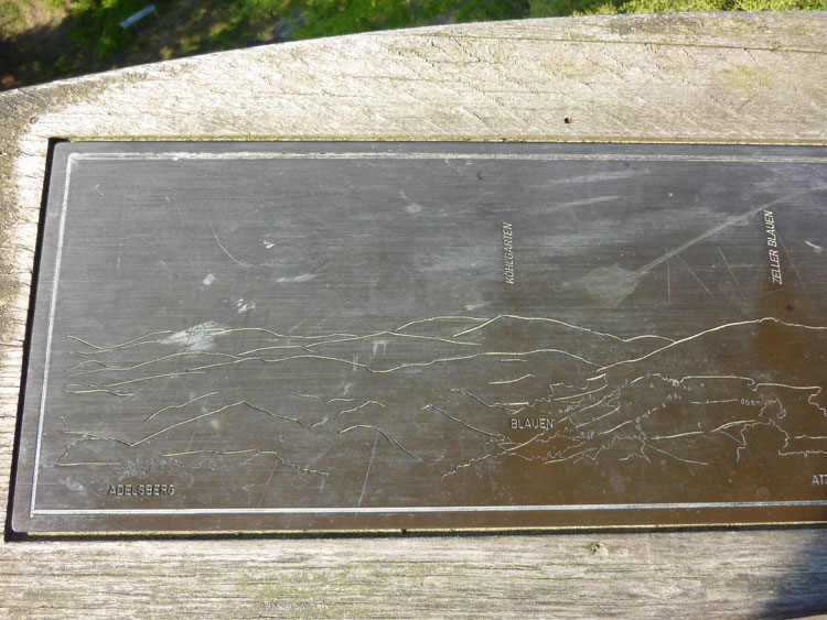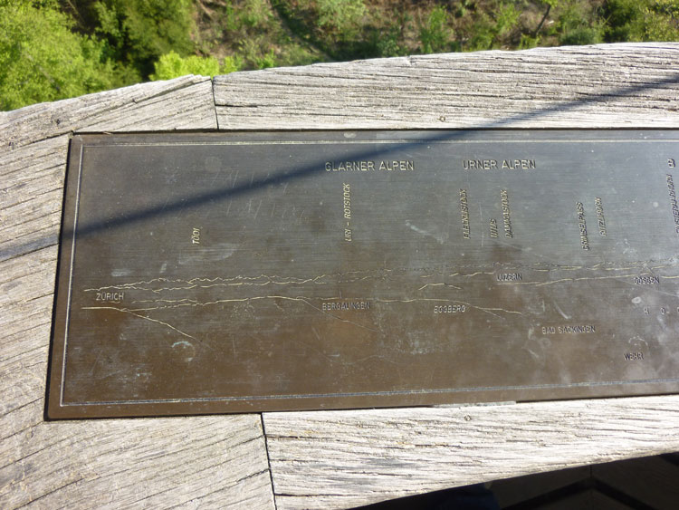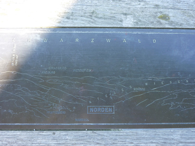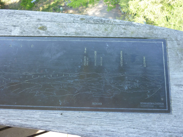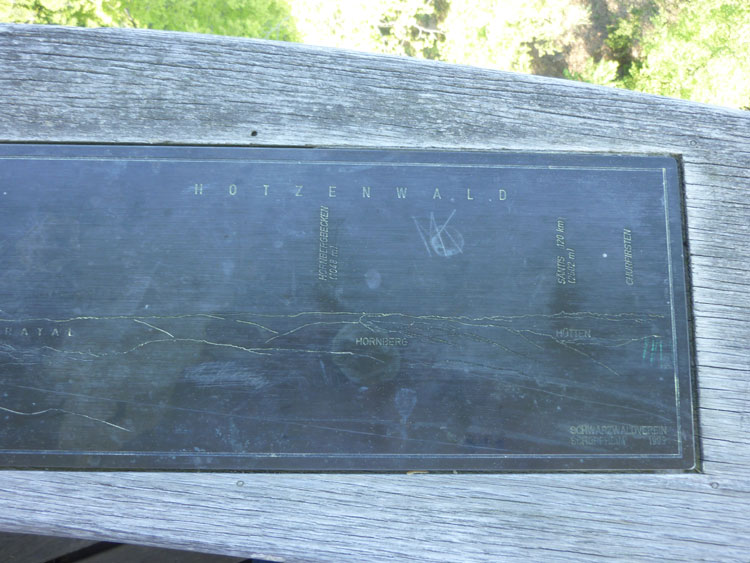 Links im Landschaftsfoto sehen Sie im südlicheren Osten den Hotzenwald mit dem 1048m hoch liegenden Hornbergbecken und darunter die Gemeinde Hornberg. Die sich daran anschließende Alpenkette verläuft über den Säntisgipfel (2502m) zum Churfirsten. |