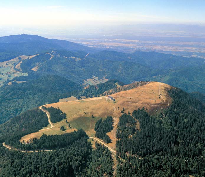 Das Belchenhaus auf 1357m ist ein Gasthof mit Aussicht bis zu den Alpen. Nach dem Aussichtsvideo ist es auf den Luftbildern, bei genauem Betrachten zweier Fotos, zu sehen. |