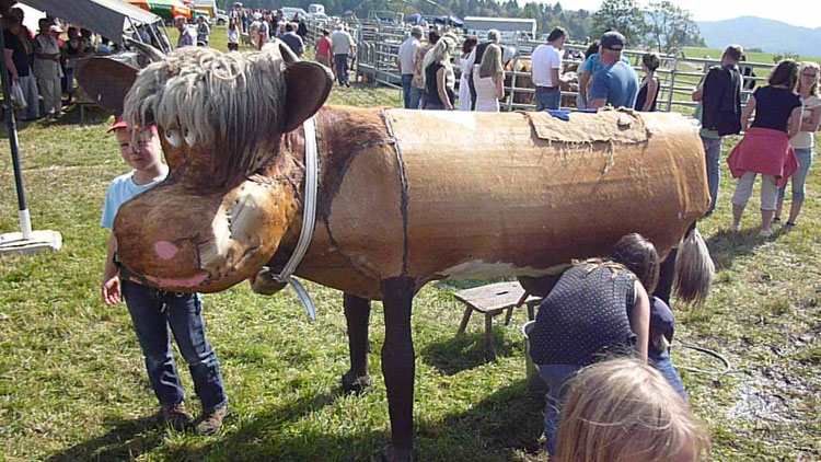 Das Melkmodell einer Kuh am Weidefest im Schwarzwalddorf Gersbach wird von Kindern sehr gut angenommen. Bereits kurz nach dem Aufbau sitzen die ersten Kinder auf dem Schemel und auch von der anderen Seite muss sich unsere geduldige Erna gleich von zwei weiteren Kindern in der Hocke sitzend melken lassen. |