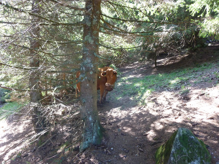 Wiesenumzäunungen reichen manchmal bis in den Schwarzwald hinein: Die Kuh auf dem folgenden Foto hat sich nicht über den Weidezaun hinweg in den Schwarzwald abgesetzt. Was das Tier dort zu fressen findet erscheint auf dem Foto nicht. |